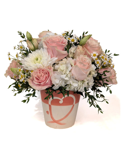 The floral display features pillowy white hydrangeas and elegant light pink roses, accented by the playful, daisy-like faces of delicate chamomile. Pink lisianthus adds a touch of sophisticated grace, while the airy, trailing leaves of parvifolia eucalyptus provide a fresh, aromatic finish. The bouquet is tucked into a modern pink and white vase with a whimsical heart design—a sweet reminder that love and kindness are always in season.
