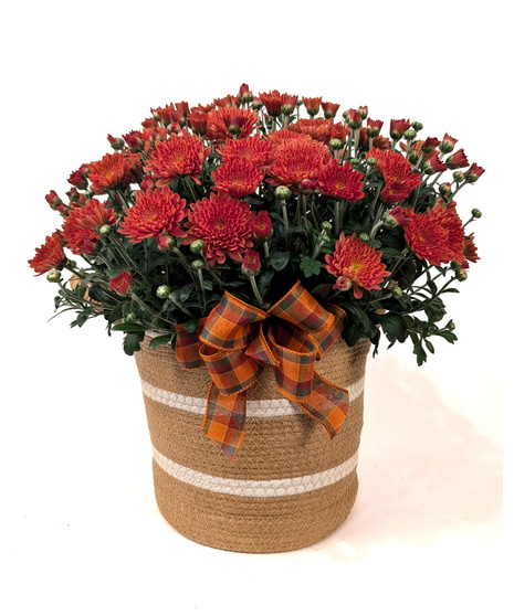 Embrace the vibrant hues of autumn with our Basket Case - a stunning fall mum nestled in a decorative jute basket, adorned with a plaid bow for a touch of classic charm. Grown with care in our greenhouse, this hardy mum is perfect for adding a touch of seasonal beauty to your home or as a thoughtful gift for a loved one.