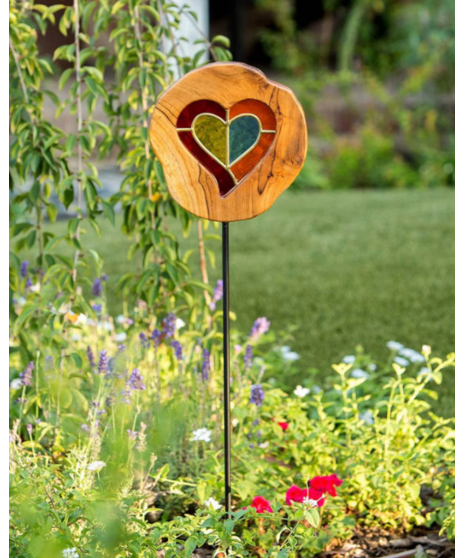 Teak Slab Stained Glass Heart Garden Stake