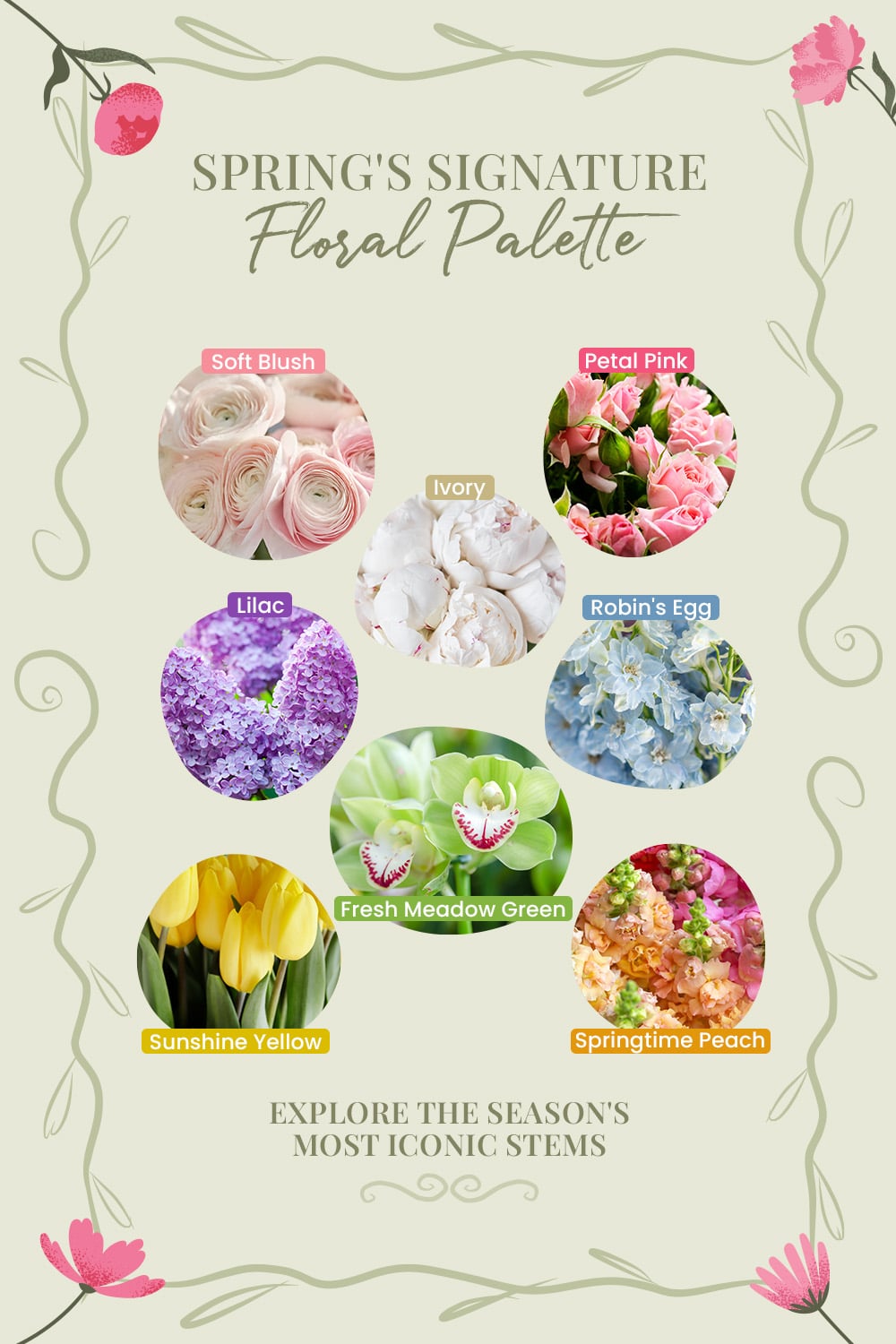 - Fresh Meadow Green — Spring wouldn't exist without its lush, renewing greens, the hallmark of the season. Inspired by new grass, budding leaves, and flourishing gardens, meadow green adds vitality and grounding energy to florals. These tones bring freshness and life, allowing colorful blossoms to shine while maintaining a natural, garden-inspired aesthetic.