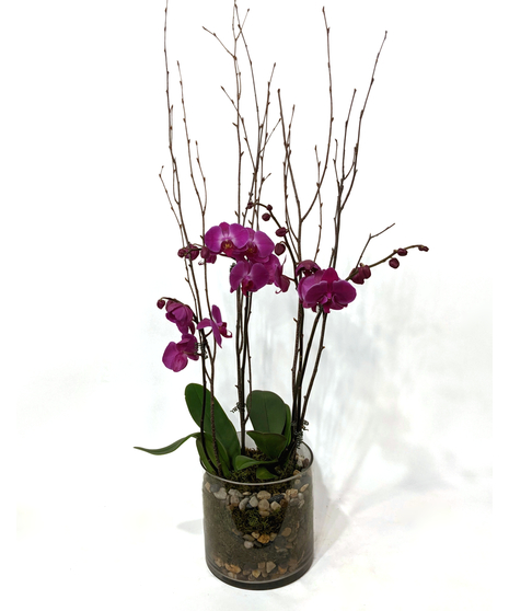 Transform your space into a serene sanctuary with the Orchid Oasis. This is more than just a planter; it is meticulously crafted by our expert plant designers to be a living piece of art. Multiple phalaenopsis orchids cascade from a classy ceramic container, artfully intertwined with lush green ferns and a blanket of soft moss.